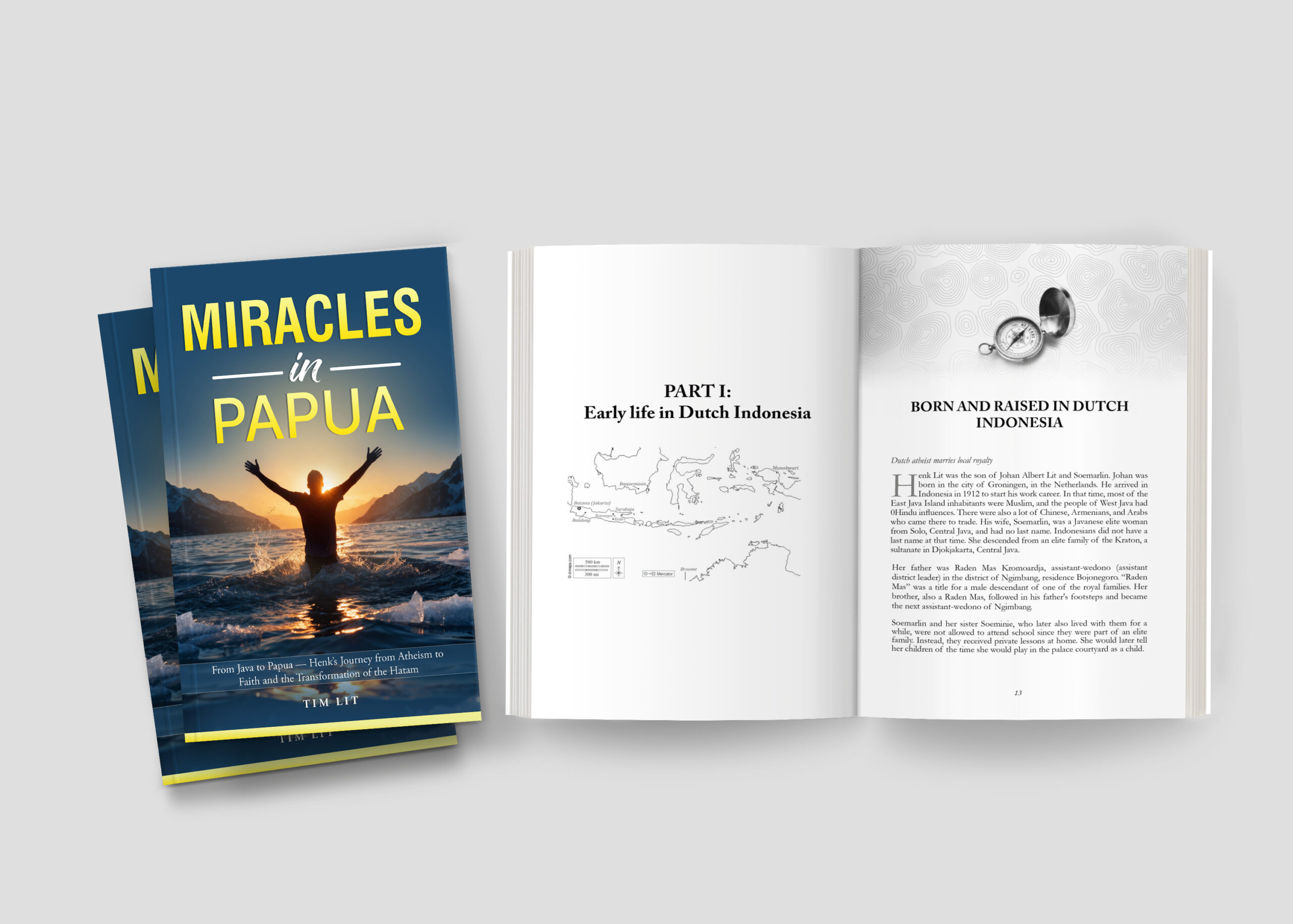 We’d like to recommend our first published book called “Miracles in Papua”, telling the story of an Eurasian family that moved from Java to Manokwari, Papua, and their faithstory and impact on the local Hatam people. This interesting book gives a background story of those who sacrificed their lives to reach the Papua, eventually seeing the Hatam people have the bible in their own language. It will be released by October the 19th, 2025.